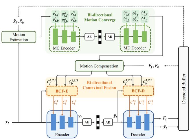 针对这一瓶颈,快手研究团队提出了全新的BRHVC 编码框架,通过引入双向运动融合(BMC)与双向上下文融合(BCF)两大关键创新模块,实现了对参考信息的自适应调和。得益于更精准的运动刻画和更均衡的参考融合机制,BRHVC 在压缩性能上超越最新传统标准VTM-RA编码器,取得了双向智能视频压缩领域的重要突破,也为未来智能视频编码的发展提供了新的方向。